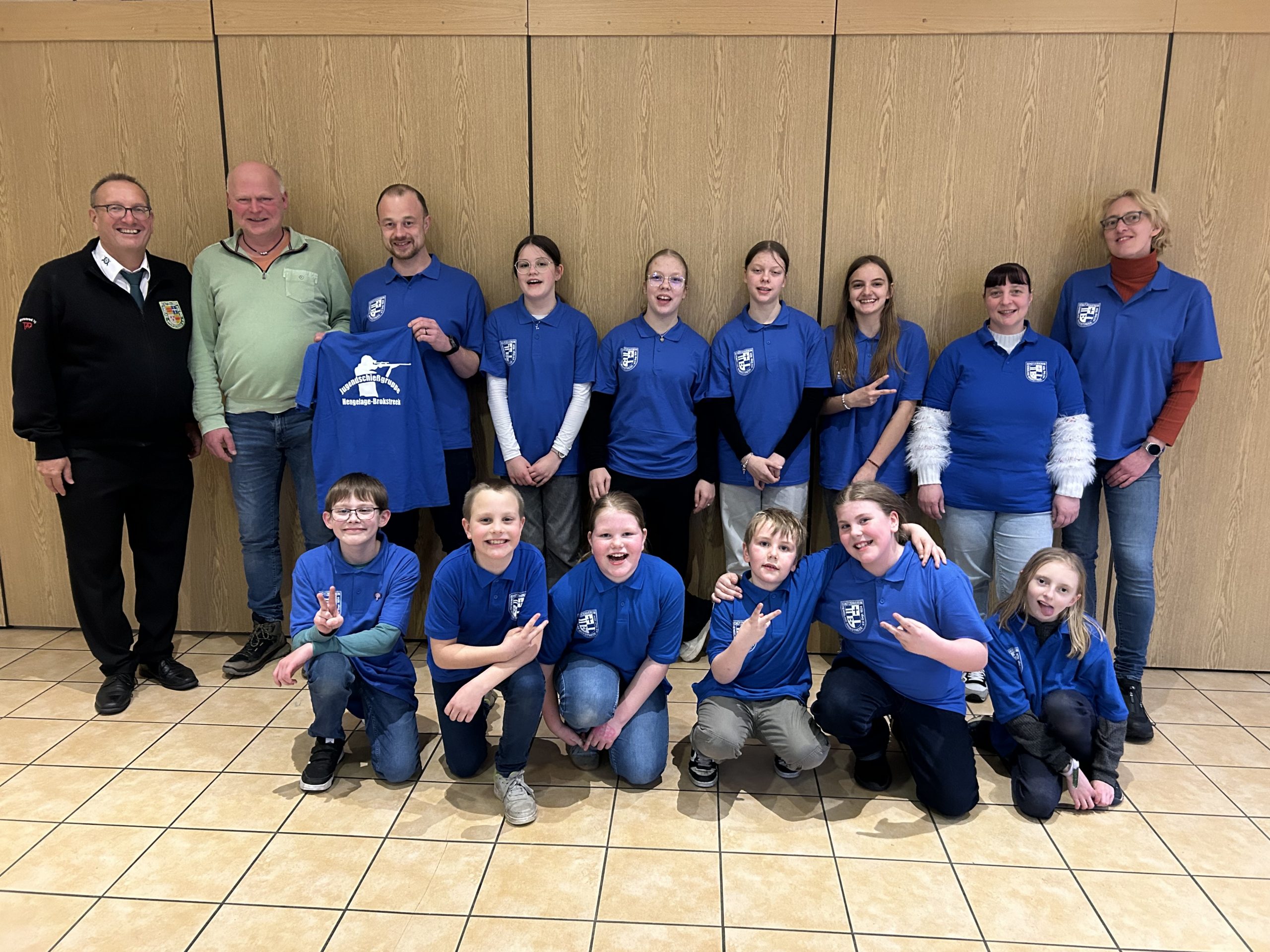 Die Jungendgruppe mit Präsident Stephan Blumenthal, Sponsor Jens Huslage, Oberschießmeister Frank Korbicki sowie den Betreuern Ute Schwarting, Gerd Doliesen und Rebecca Tepe